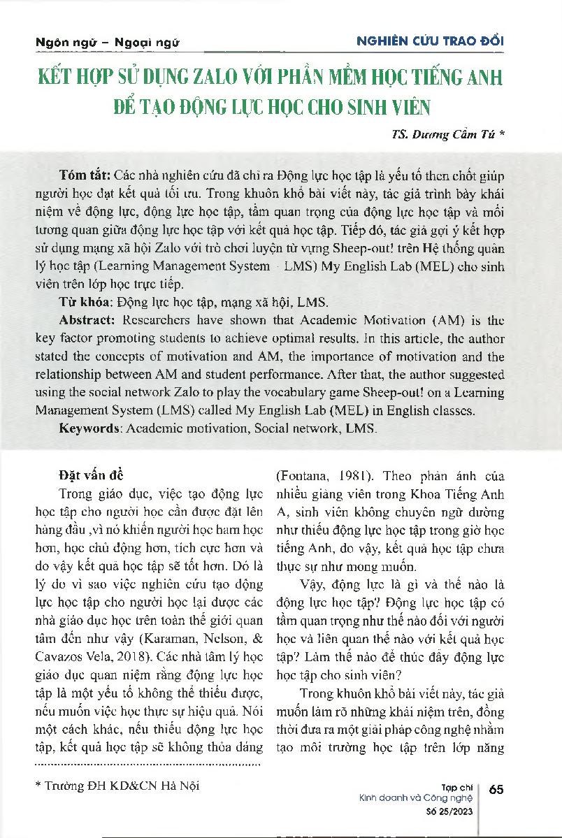 Kết hợp sử dụng zalo với phần mềm học tiếng Anh để tạo động lực học cho sinh viên = The combination of Social network Zalo and the vocabulary practice game on LMS to create academic motivation for students