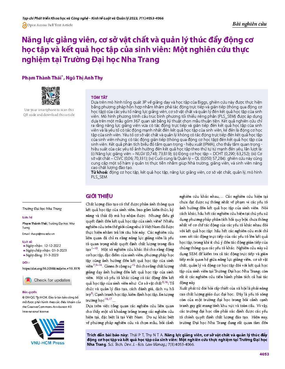 Năng lực giảng viên, cơ sở vật chất và quản lý thúc đẩy động cơ học tập và kết quả học tập của sinh viên: Một nghiên cứu thực nghiệm tại Trường Đại học Nha Trang = Instructor capacity, facilities and management promote learning motivation and student lear