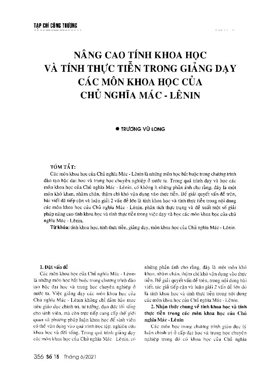 Nâng cao tính khoa học và tính thực tiễn trong giảng dạy các môn khoa học của Chủ nghĩa Mác - Lênin = Enhancing the science and the practicality of Marxism-Leninism philosophy course
