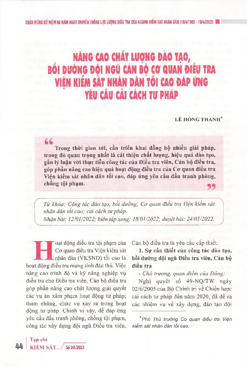 Nâng cao chất lượng đào tạo, bồi dưỡng đội ngũ cán bộ Cơ quan điều tra Viện kiểm sát nhân dân tối cao đáp ứng yêu câu cải cách tư pháp