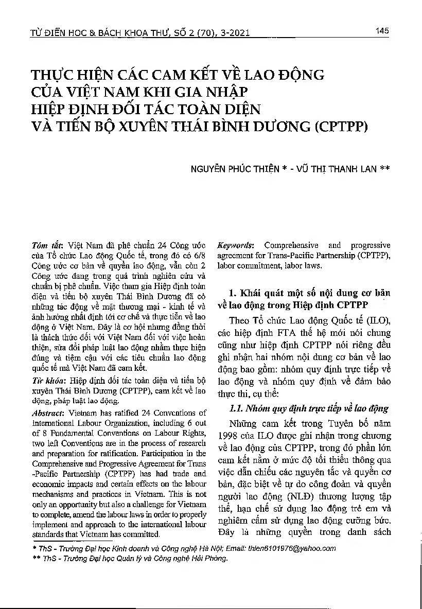 Thực hiện các cam kết về lao động của Việt Nam khi gia nhập hiệp định đối tác toàn diện và tiến bộ xuyên Thái Bình Dương (CPTPP) = Implementing Vietnam's labour commitments on joining in the Comprehensive and Progressive Agreement fo r Trans-Pacific Partnership