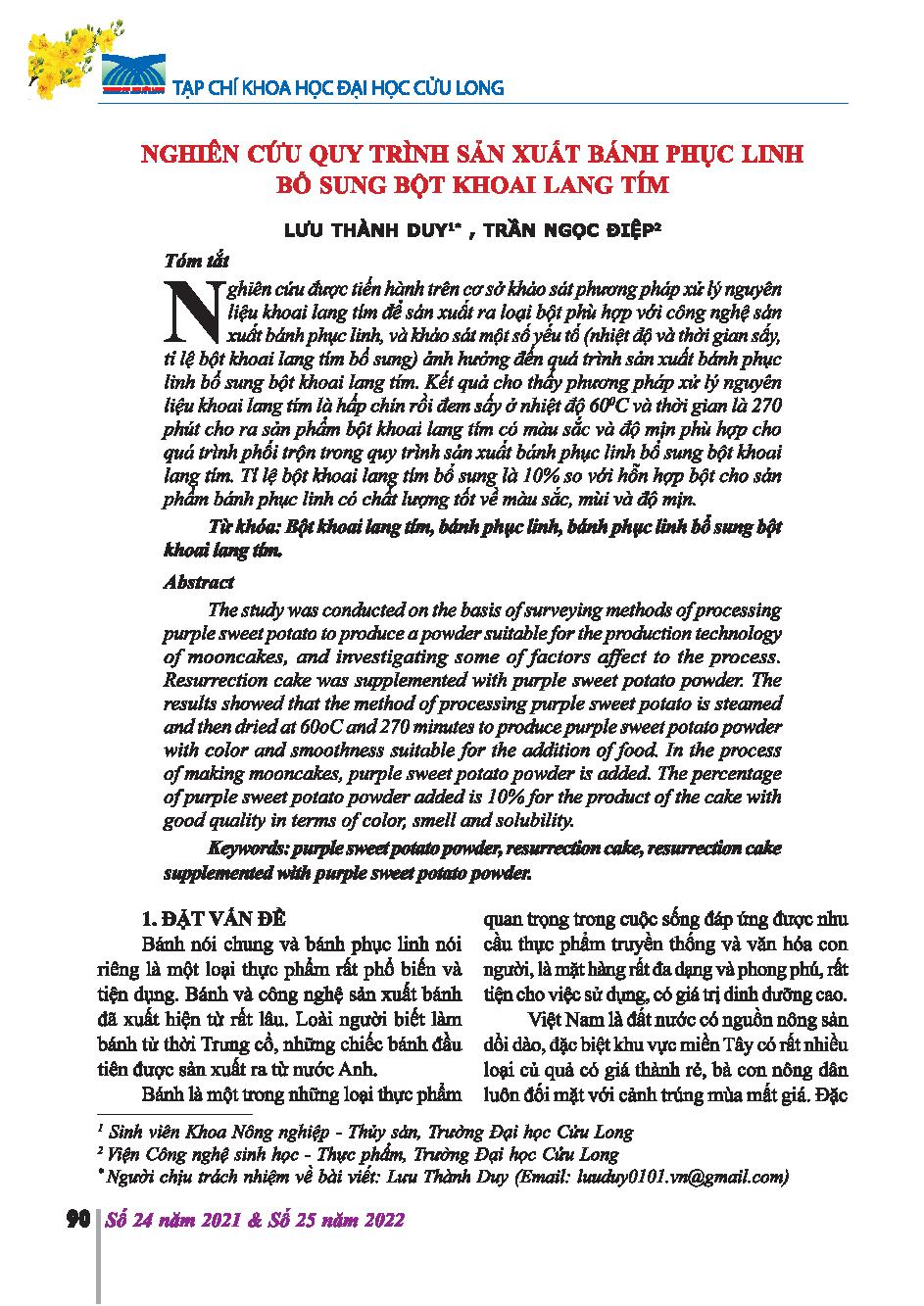 Nghiên cứu quy trình sản xuất bánh phục linh bổ sung bột khoai lang tím = Research on the production process of mooncakes supplemented with purple sweet potato powder