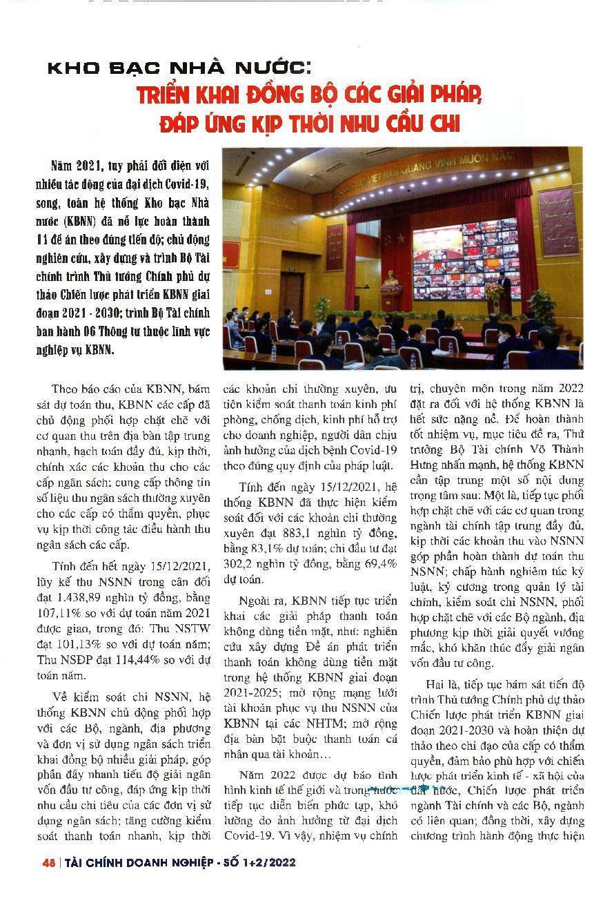 Kho bạc nhà nước: Triển khai đồng bộ các giải pháp, đáp ứng kịp thời nhu cầu chi = State Treasury: Synchronously deploying solutions to promptly meet spending needs