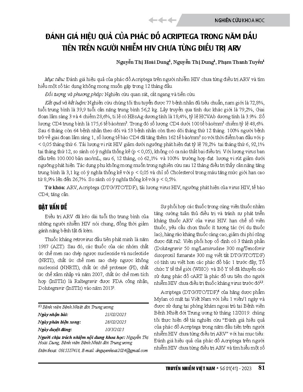 Đánh giá hiệu quả của phác đồ Acriptega trong năm đầu tiên trên người nhiễm HIV chưa từng điều trị ARV
