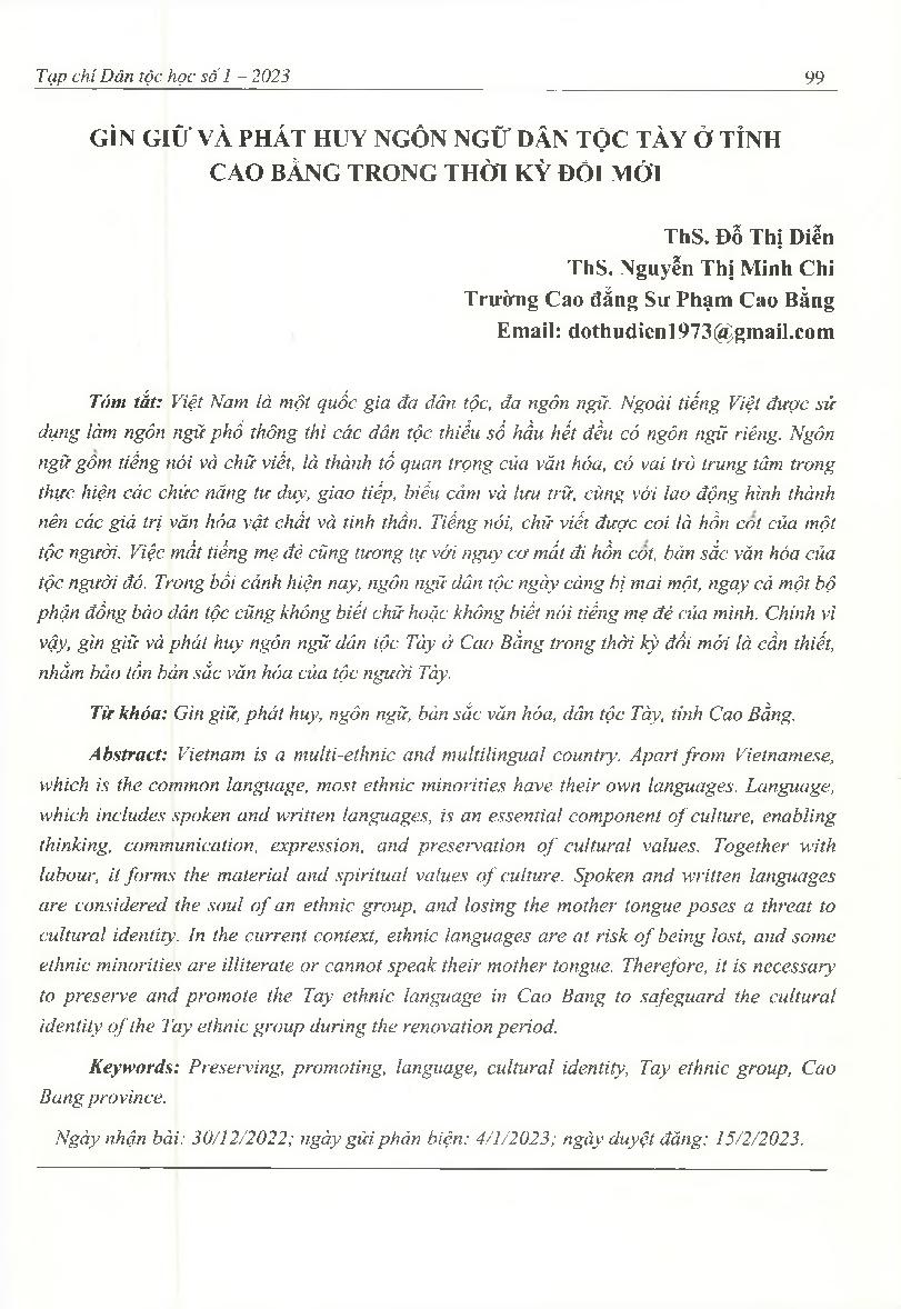 Gìn giữ và phát huy ngôn ngữ dân tộc Tày ở tỉnh Cao Bằng trong thời kỳ đổi mới = Preserving and Promoting Tay Ethnic Language in Cao Bang Province in the Doi Moi Period