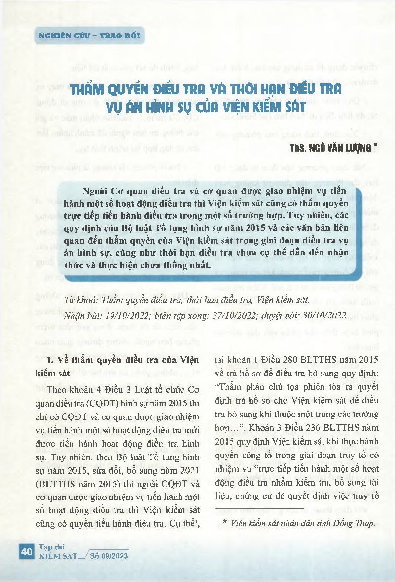 Thẩm quyền điều tra và thời hạn điều tra vụ án hình sự của Viện kiểm sát
