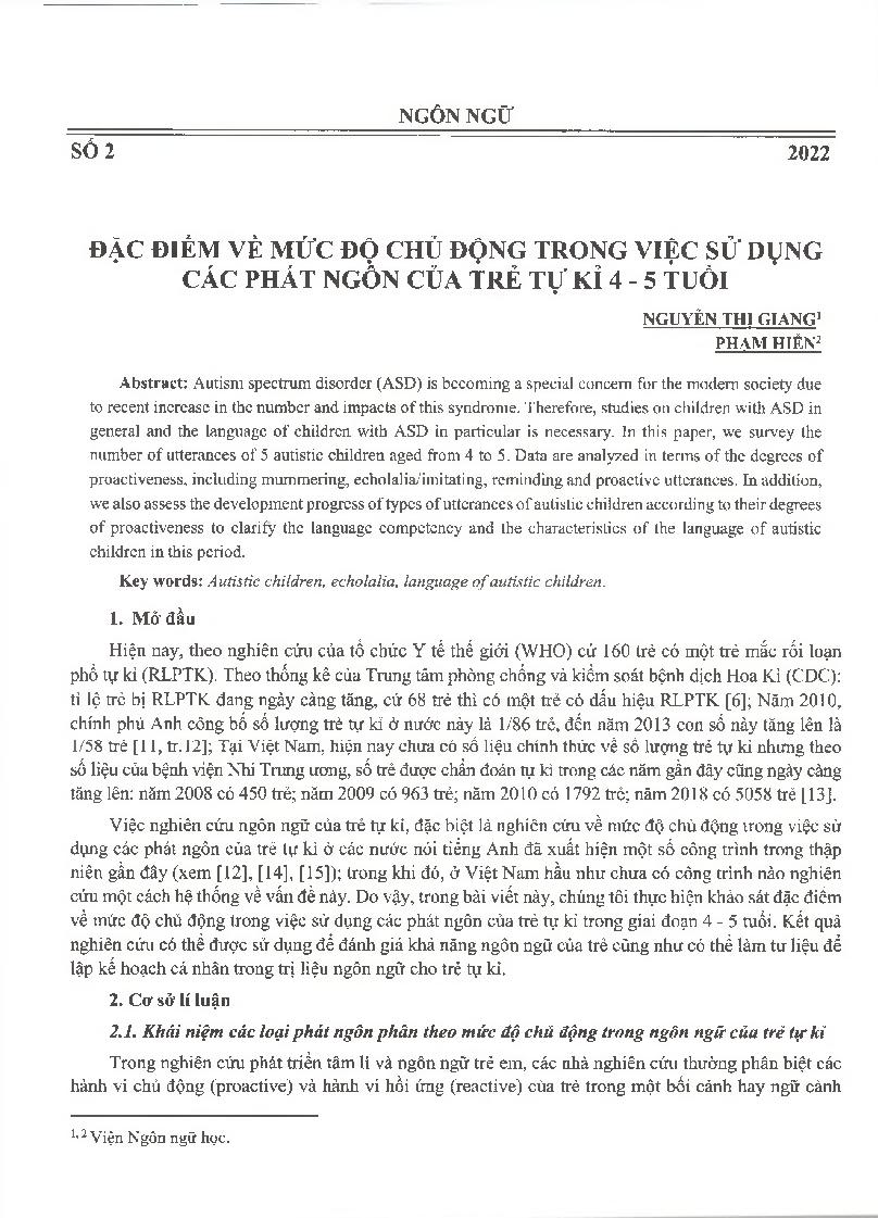 Đặc điểm về mức độ chủ động trong việc sử dụng các phát ngôn của trẻ tự kỉ 4 - 5 tuổi = Characteristics of proactiveness in the usages of utterances of autistic children from 4 to 5 years old