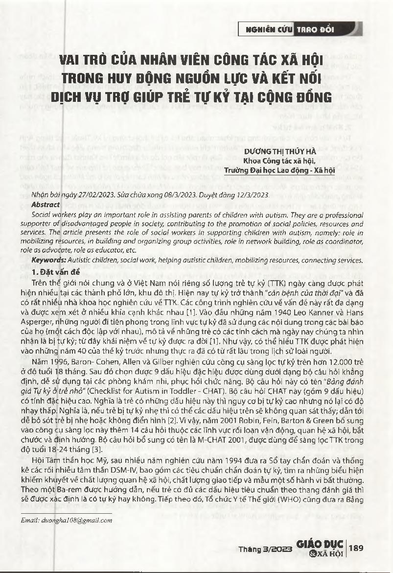 Vai trò của nhân viên còng tác xã hội trong huy động nguồn lực và kết nối dịch vụ trợ giúp trẻ tự kỷ tại cộng đóng = The role of social workers in mobilizing resources and connecting support services for children with autism in the community