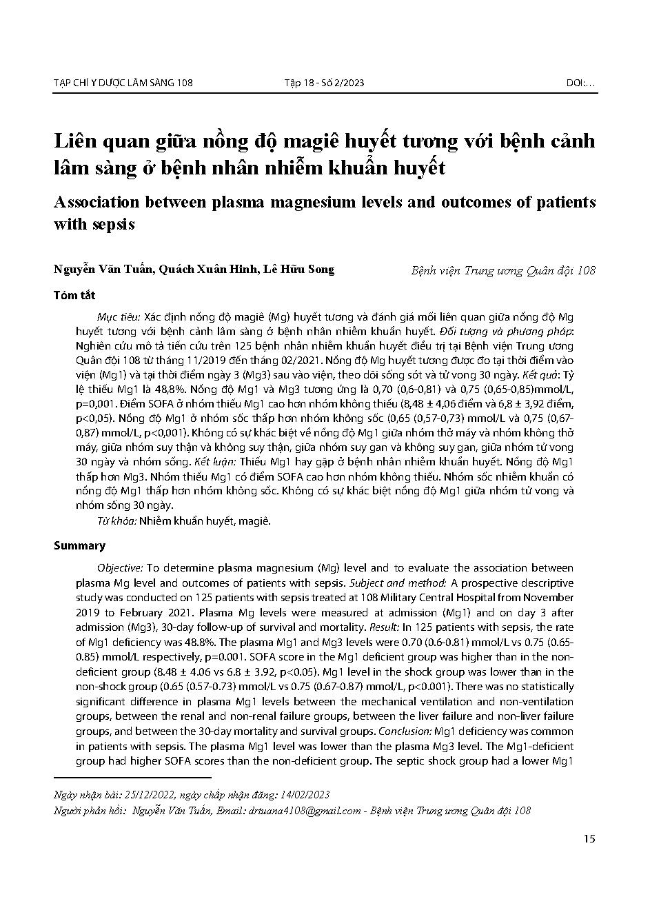 Liên quan giữa nồng độ magiê huyết tương với bệnh cảnh lâm sàng ở bệnh nhân nhiễm khuẩn huyết = Association between plasma magnesium levels and outcomes of patients with sepsis