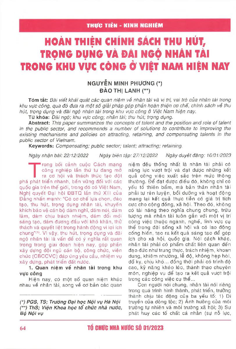 Hoàn thiện chính sách thu hút, trọng dụng và đãi ngộ nhân tài trong khu vực công ở Việt Nam hiện nay = Improving the existing policies on attracting, retaining, and compensating talents in the public sector of Vietnam