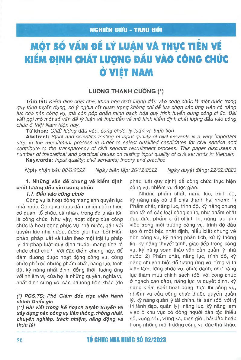 Một số vấn để lý luận và thực tiền vé kiểm định chất lượng đầu vào công chức ở Việt Nam = A number of theoretical and practical issues on testing input quality of civil servants in Vietnam