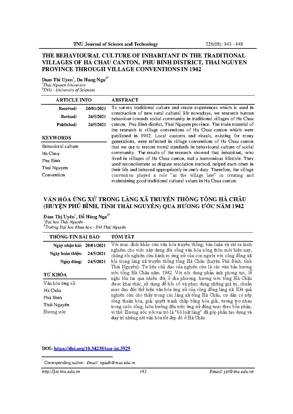 Văn hóa ứng xử trong làng xã truyền thống tổng hà châu (huyện Phú Bình, tỉnh Thái Nguyên) qua hương ước năm 1942 = The behavioural culture of inhabitant in the traditional villages of ha chau canton, phu binh district, thai nguyen province through village conventions in 1942