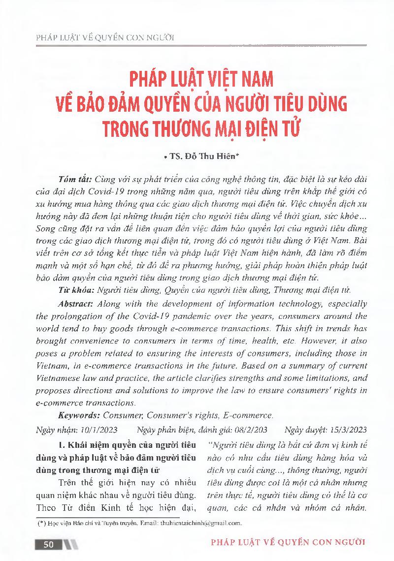 Pháp luật Việt Nam vể bảo đảm quyến của người tiêu dùng trong thương mại điện tử = Vietnamese law on ensuring the rights of consumers in e-commerce