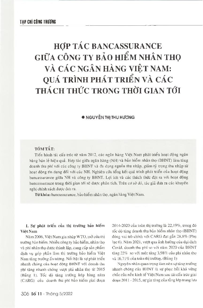 Hợp tác bancassurance giữa công ty bảo hiểm nhân thọ và các ngân hàng Việt Nam: Quá trình phát triển và các thách thức trong thời gian tới = Bancassurance - The cooperation between banks and life insurers: The development and upcoming challenges