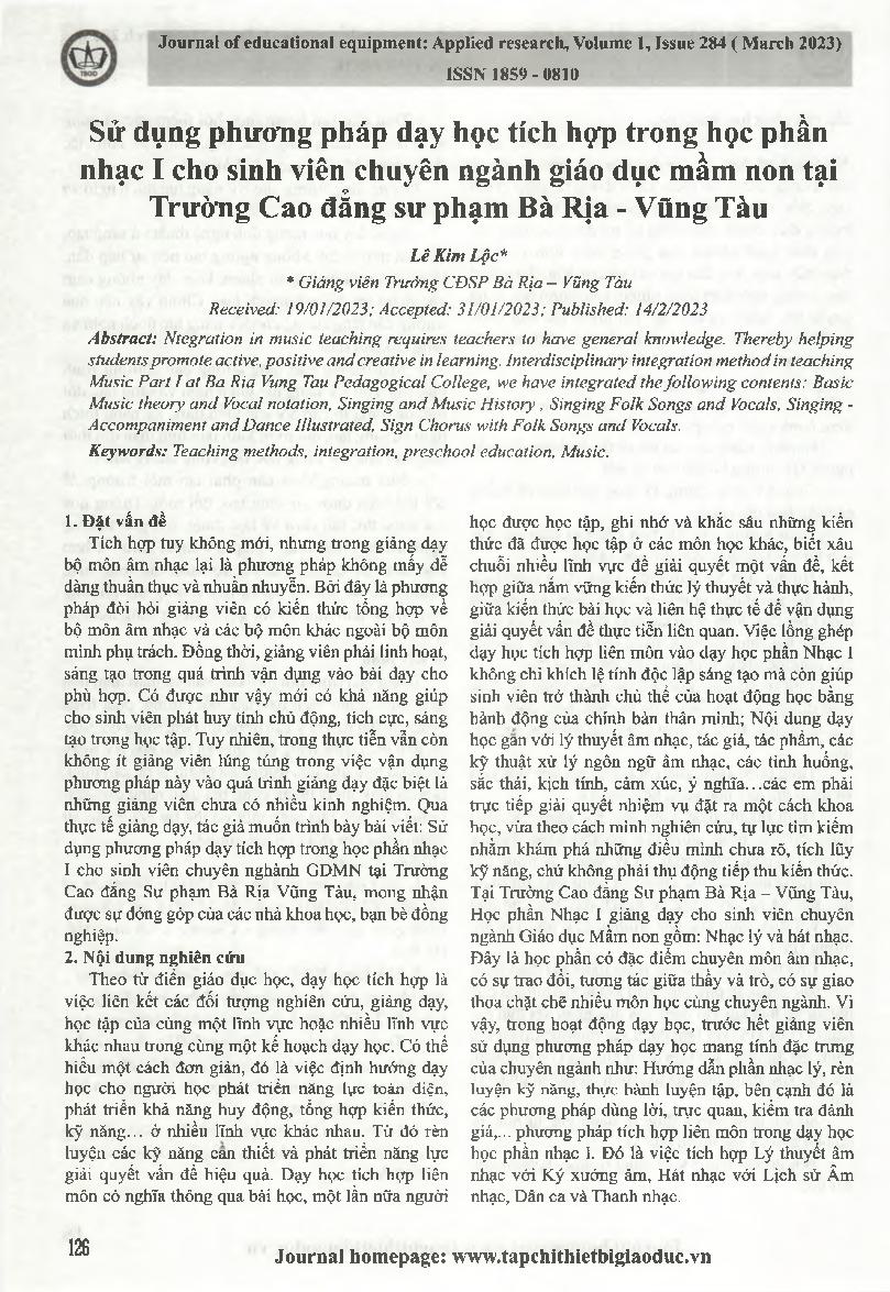 Sử dụng phương pháp dạy học tích hợp trong học phần nhạc I cho sinh viên chuyên ngành giáo dục mầm non tại Trường Cao đẳng sư phạm Bà Rịa - Vũng Tàu = Using integrated teaching methods in music module I for students majoring in preschool education at Ba R