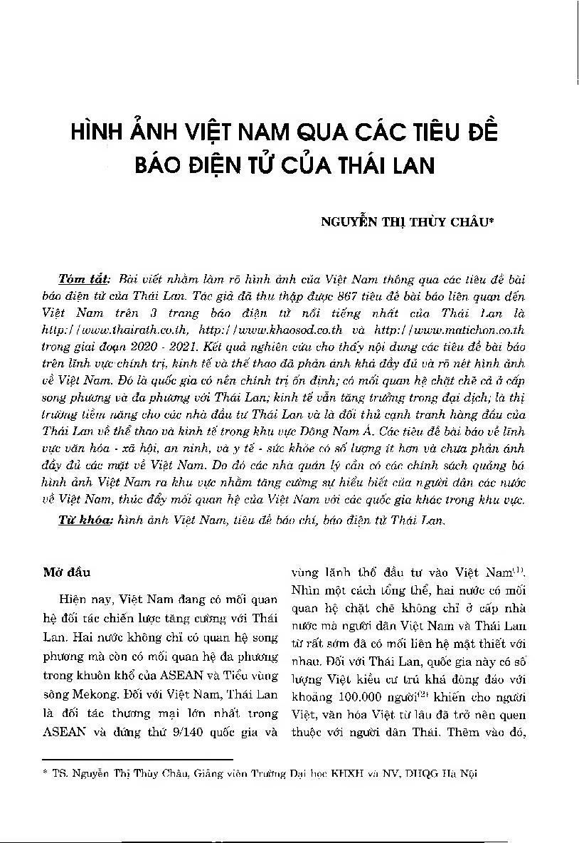 Hình ảnh Việt Nam qua các tiêu đề báo điện tử của Thái Lan = The Vietnam’s Image Reflected in the Headlines of Thai Online Newspapers