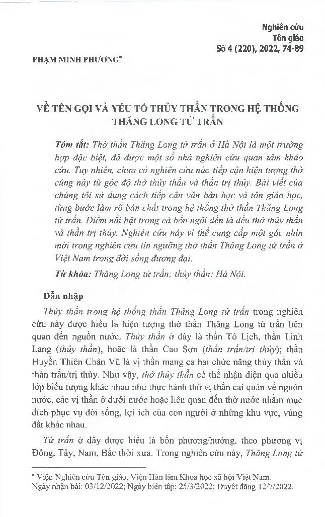 Về tên gọi và yếu tố thủy thần trong hệ thống Thăng Long tứ trấn = Water deity in the system four guarding temples of Thang Long