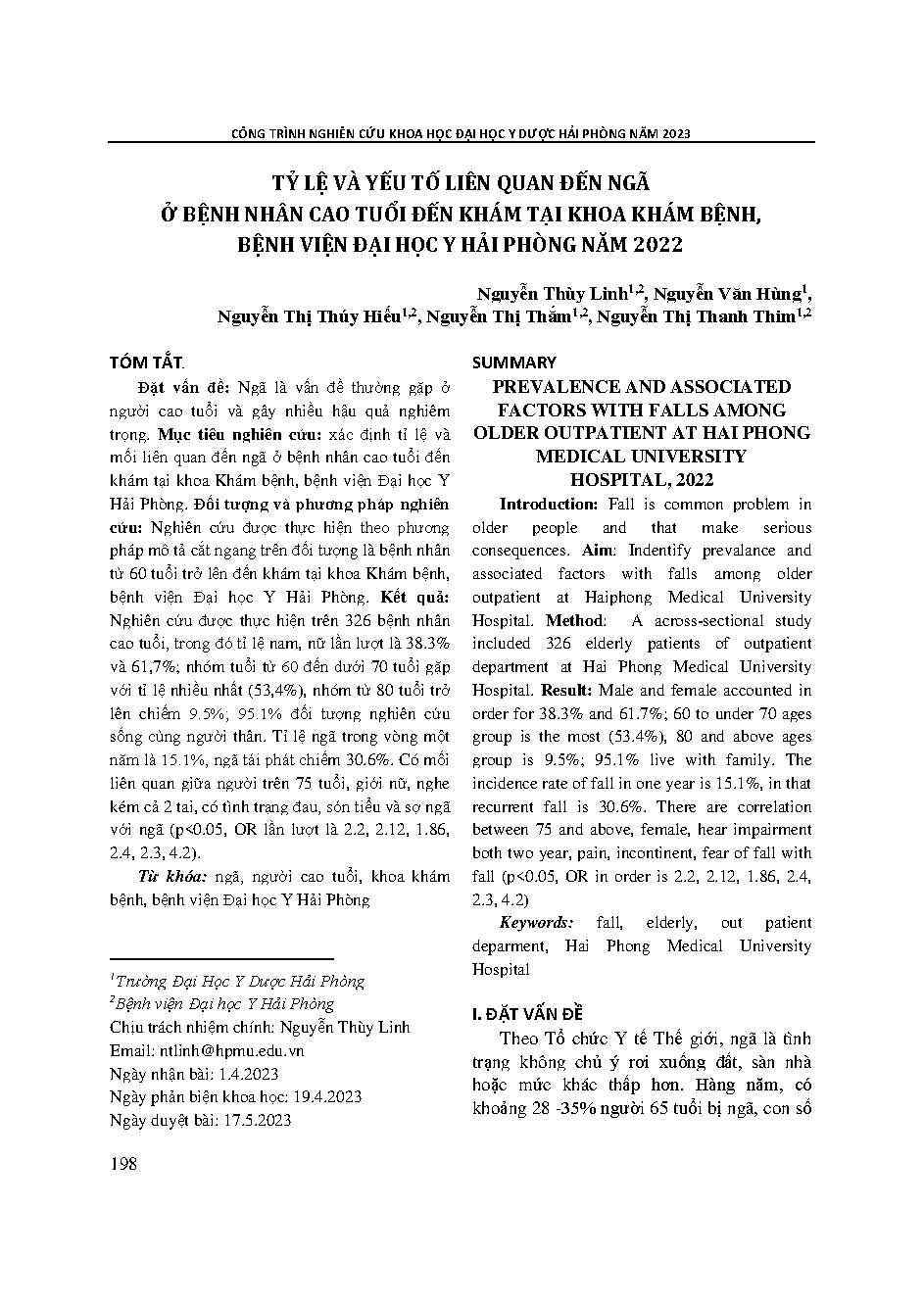 Tỷ lệ và yếu tố liên quan đến ngã ở bệnh nhân cao tuổi đến khám tại khoa khám bệnh, Bệnh viện Đại học Y Hải Phòng năm 2022