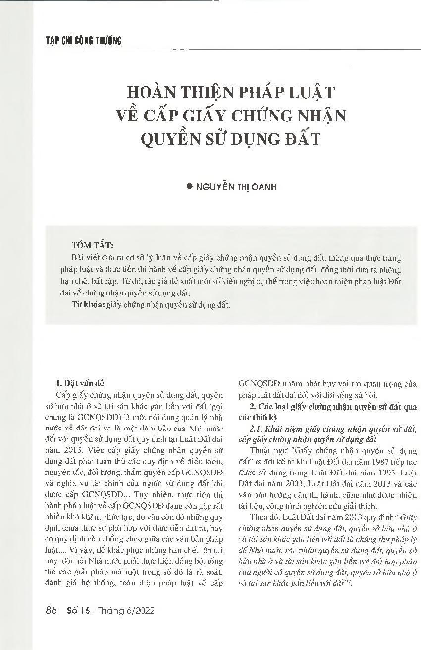 Hoàn thiện pháp luật về cấp giấy chứng nhận quyền sử dụng đất = Improving the effectiveness of regulations on the issuance of land use right certificate