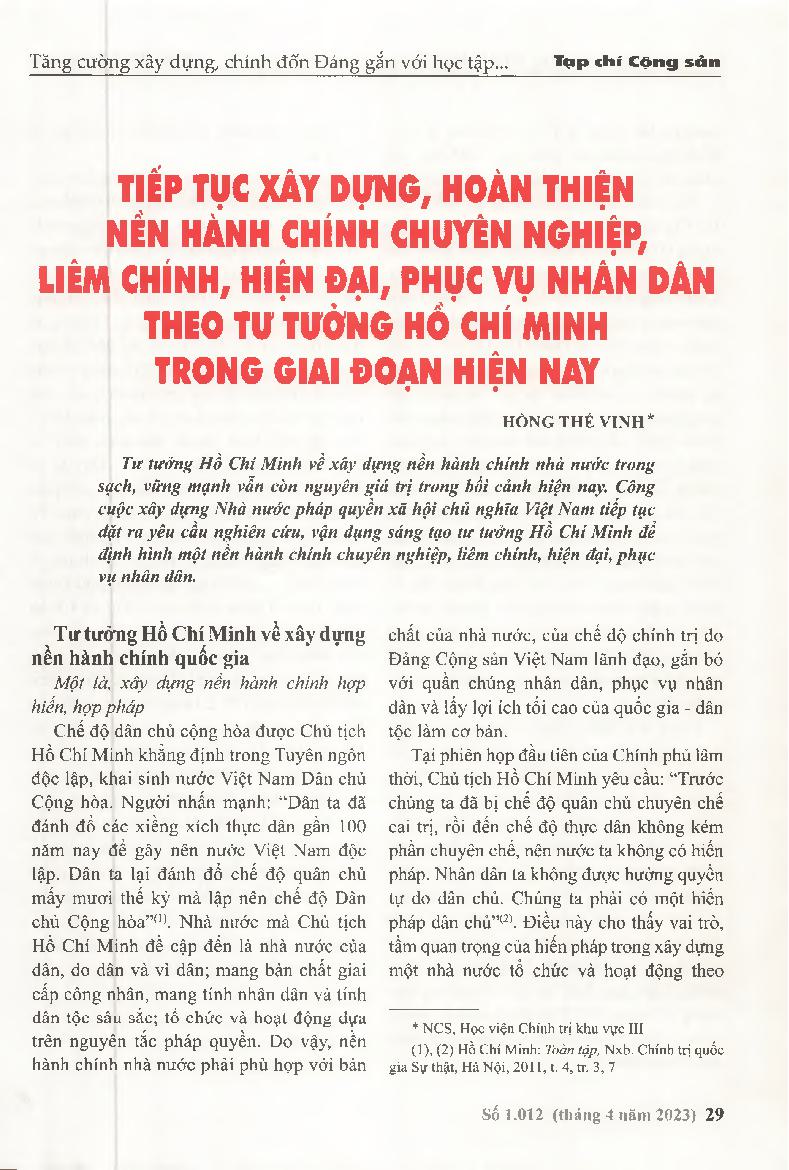 Tiếp tục xây dựng, hoàn thiện nền hành chính chuyên nghiệp, liêm chính, hiện đại, phục vụ nhân dân theo tư tưởng Hồ Chí Minh trong giai đoạn hiện nay