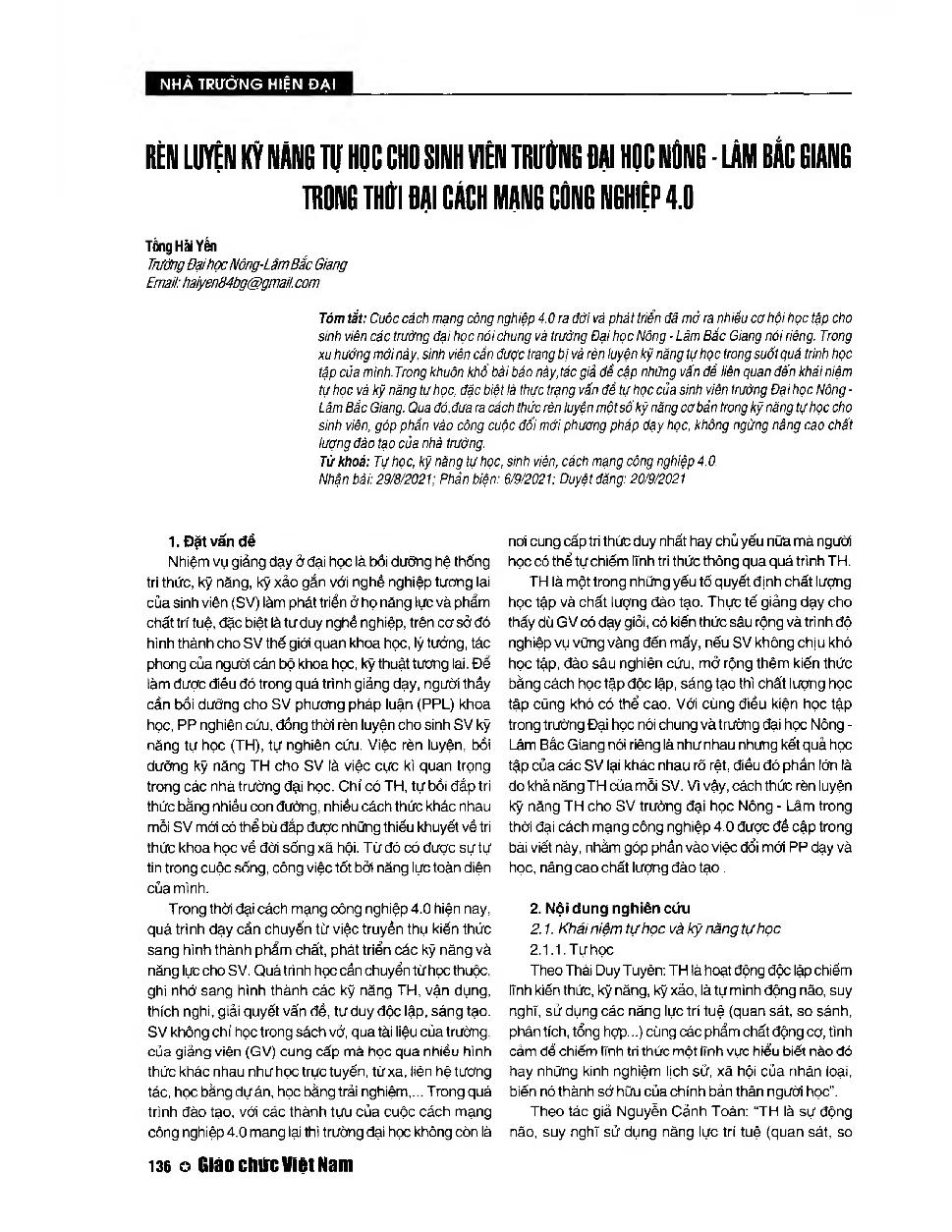 Rèn luyện kỹ năng tự học cho sinh viên trường Đại học nông - lâm Bắc Giang = Self-study skills training for the students of Bac Giang University of Agriculture and Forestry in the era of industrial revolution 4.0