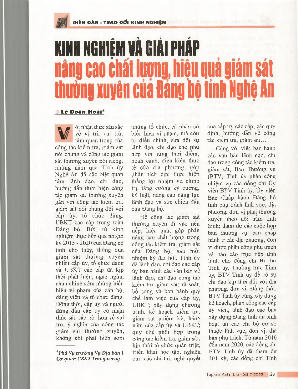 Kinh nghiệm và giải pháp nâng cao chất lượng, hiệu quả giám sát thường xuyên của Đảng bộ tỉnh Nghệ An