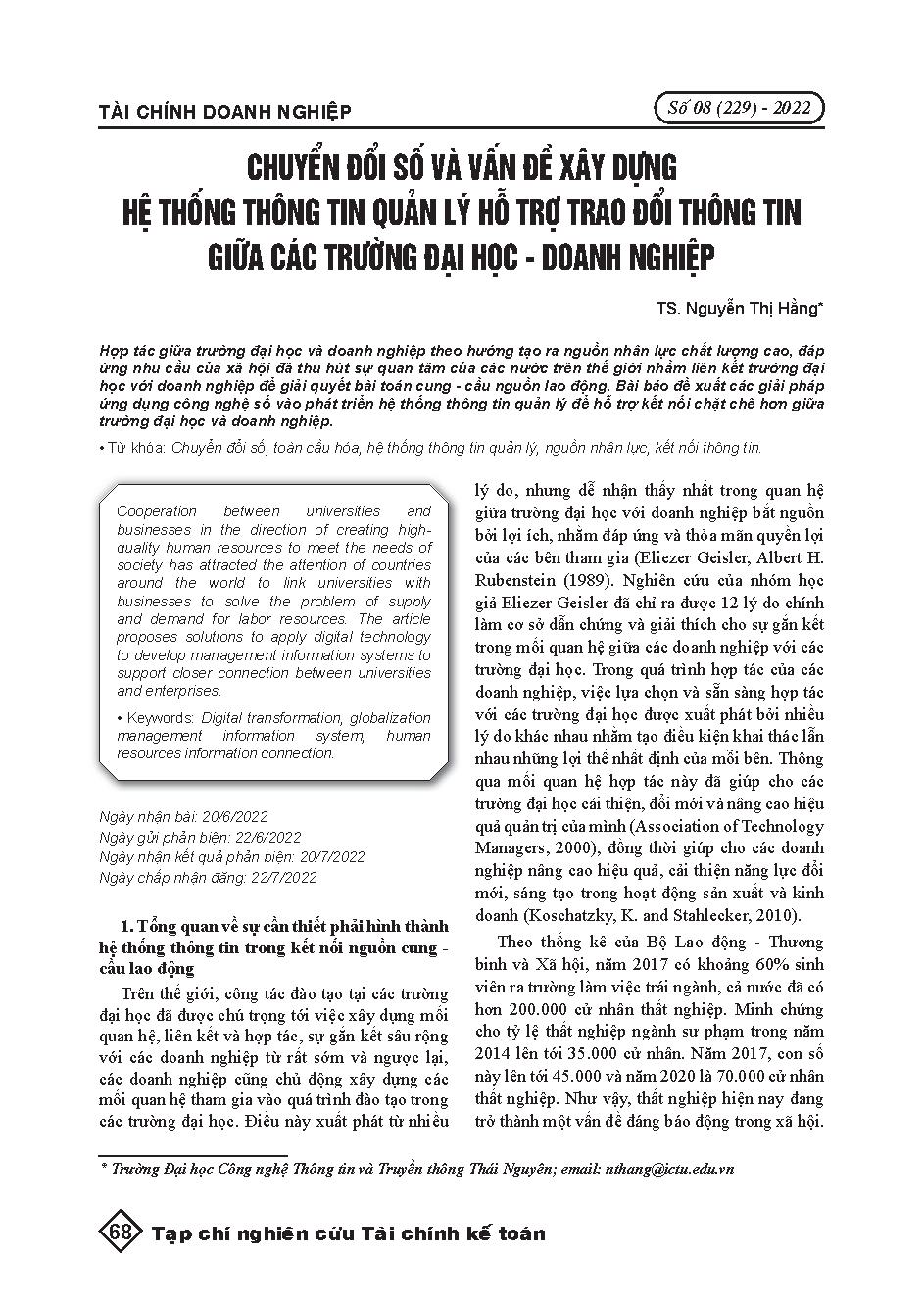 Chuyển đổi số và vấn đề xây dựng hệ thống thông tin quản lý hỗ trợ trao đổi thông tin giữa các trường đại học - doanh nghiệp = Digital transformation and the designation of an information system supporting information exchange among universities and enter