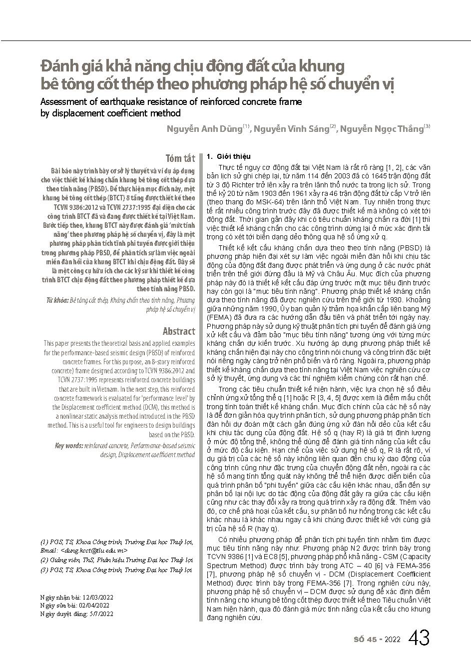 Đánh giá khả năng chịu động đất của khung bê tông cốt thép theo phương pháp hệ số chuyển vị = Assessment of earthquake resistance of reinforced concrete frame by displacement coefficient method