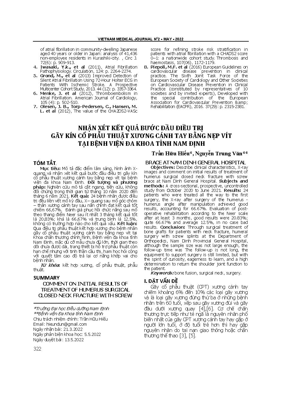 Nhận xét kết quả bước đầu điều trị gãy kín cổ phẫu thuật xương cánh tay bằng nẹp vít tại Bệnh viện Đa khoa tỉnh Nam Định = Comment on initial results of treatment of humerus surgical closed neck fracture with screw brace at Nam Dinh general hospital