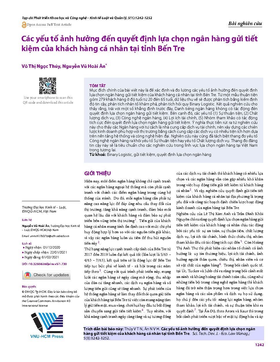 Các yếu tố ảnh hưởng đến quyết định lựa chọn ngân hàng gửi tiết kiệm của khách hàng cá nhân tại tỉnh Bến Tre