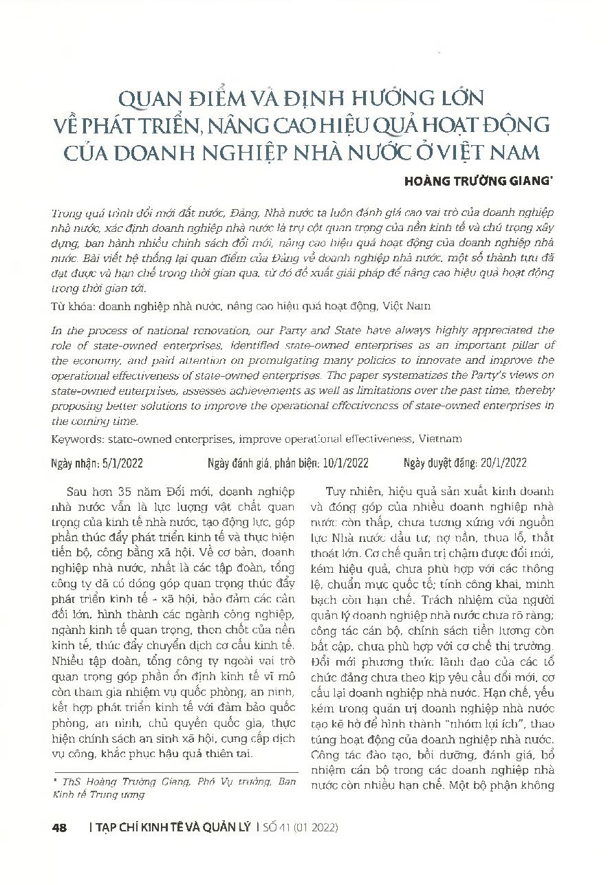 Quan điểm và định hướng lớn về phát triển, nâng cao hiệu quả hoạt động của doanh nghiệp nhà nước ở Việt Nam = Major viewpoints and orientations on improving operational effectiveness of state-owned enterprises in Vietnam