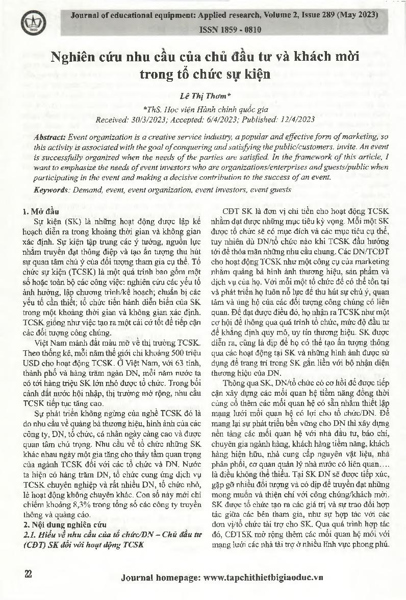 Nghiên cứu nhu cầu của chủ đầu tư và khách mời trong tổ chức sự kiện = Research the needs of investors and guests in event organization
