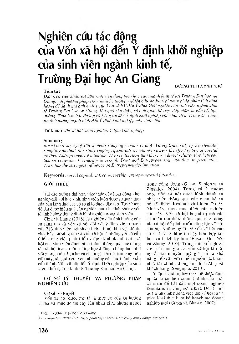 Nghiên cứu tác động của vốn xã hội đến ý định khởi nghiệp của sinh viên ngành kinh tế, Trường Đại học An Giang