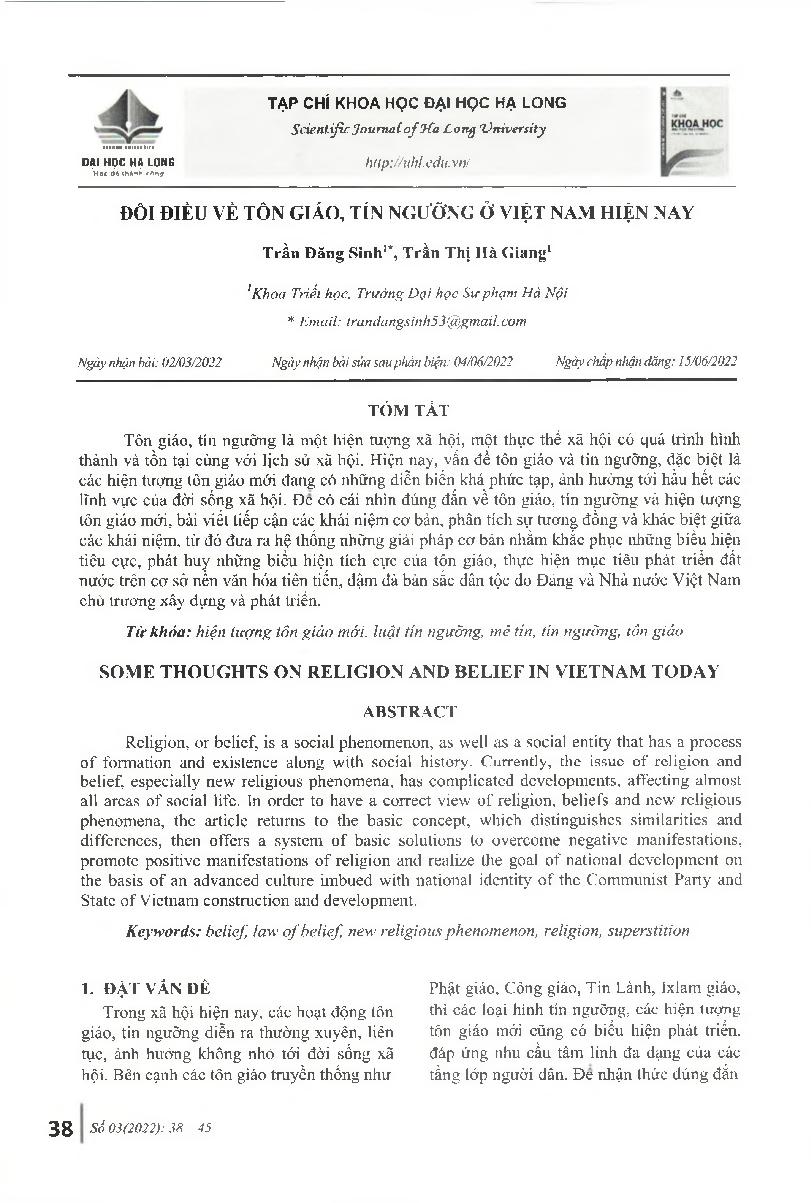 Đôi điều về tôn giáo, tín ngưỡng ở Việt Nam hiện nay = Some thoughts on religion and belief in Vietnam today