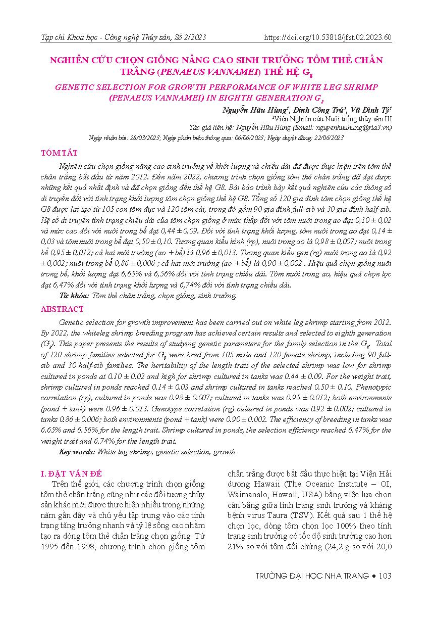 Nghiên cứu các yếu tố ảnh hưởng đến quá trình bảo quản lạnh của kết cấu hầm bảo quản sử dụng vật liệu polystyro foam trên tàu cá vỏ gỗ = Genetic selection for growth performance of white leg shrimp (penaeus vannamei) in eighth generation g8