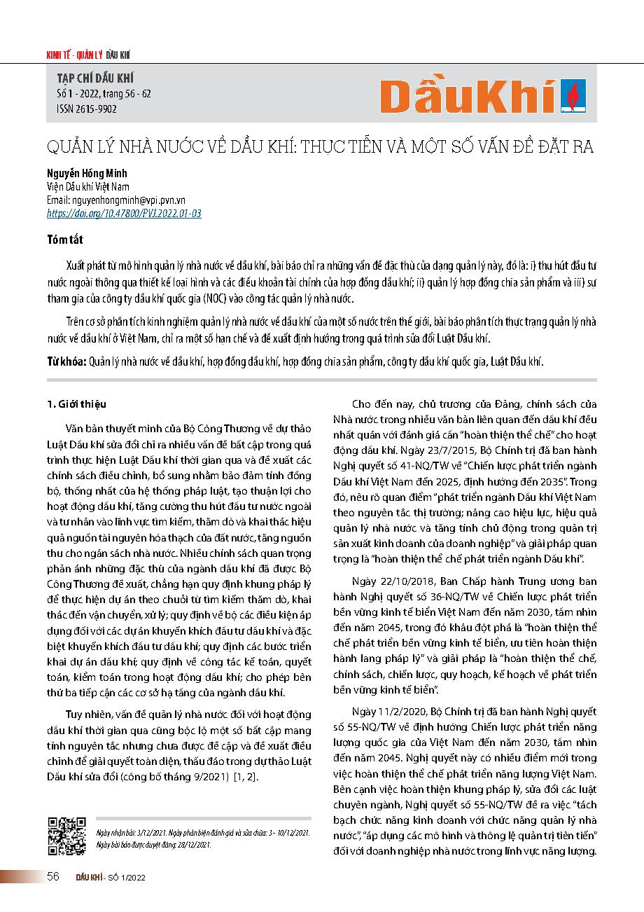 Quản lý nhà nước về dầu khí: Thực Tiễn Và Một Số Vấn Đề Đặt Ra = Public management of petroleum: Practices and issues