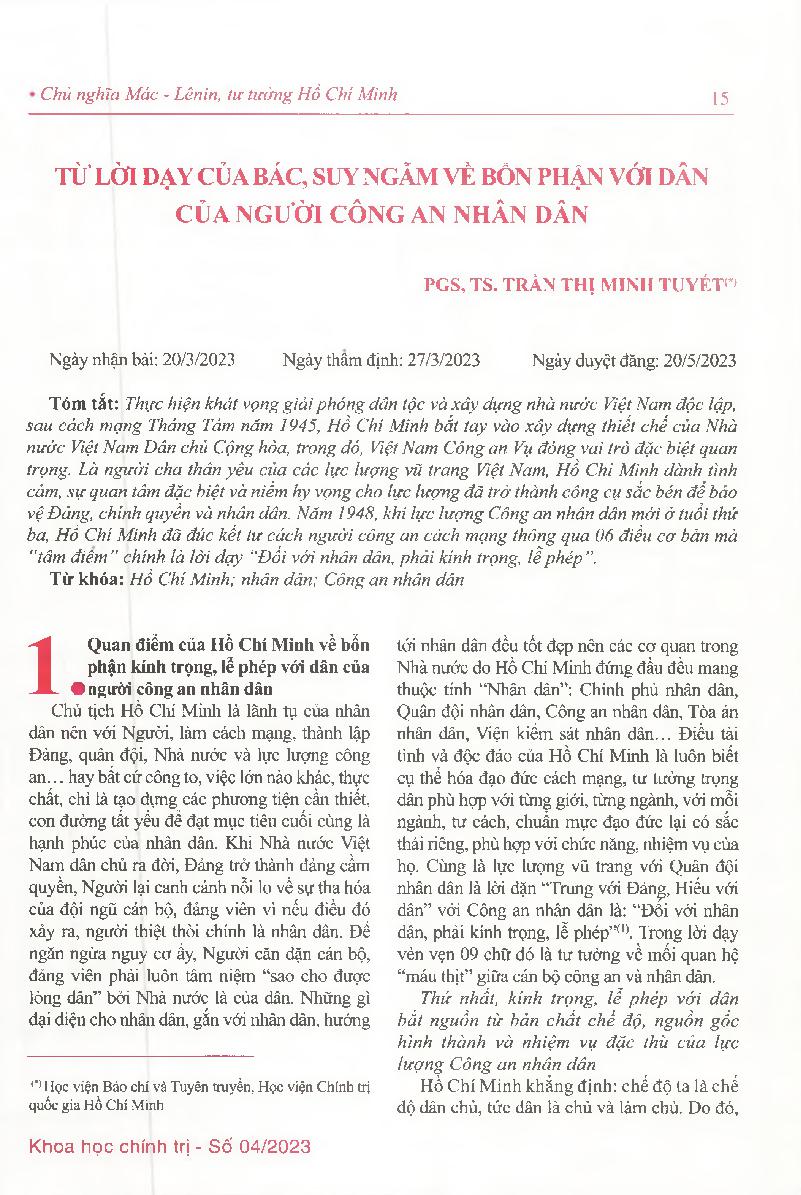 Từ lời dạy của Bác, suy ngẫm về bổn phận với dân của người công an nhân dân = From uncle Ho's teachings, reflecting on the duty of people's public security to the people