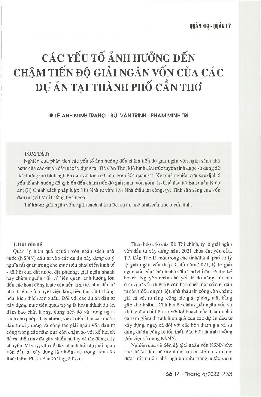 Các yếu tố ảnh hưởng đến chậm tiến độ giải ngân vốn của các dự án tại Thành phố Cần Thơ = Factors affecting the delay in the disbursement of capital from the state budget for construction projects in Can Tho city