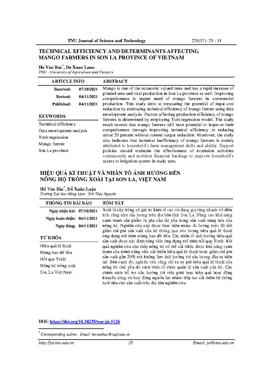 Hiệu quả kĩ thuật và nhân tố ảnh hưởng đến nông hộ trồng xoài tại Sơn La, Việt Nam = Technical efficiency and determinants affecting mango farmers in son la province of Vietnam
