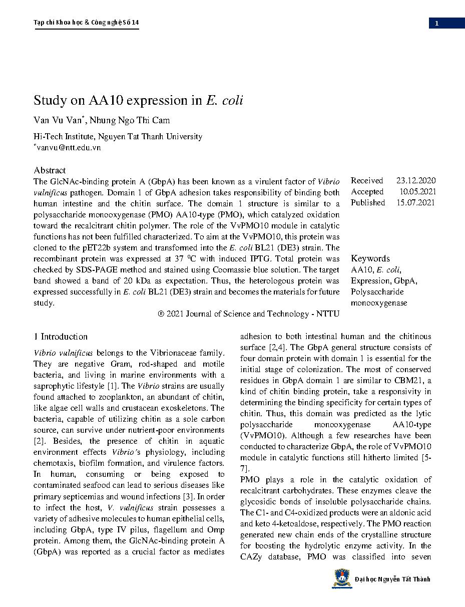 Nghiên cứu biểu hiện enzyme AA10 trong E. coli = Study on AA10 expression in E. coli