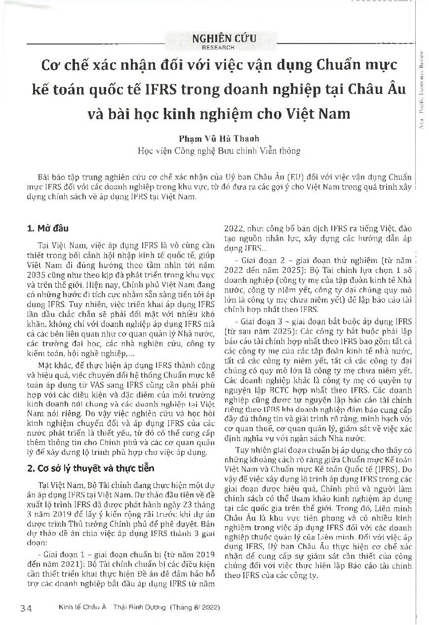 Cơ chế xác nhận đối với việc vận dụng Chuẩn mực kế toán quốc tế IFRS trong doanh nghiệp tại Châu Âu và bài học kinh nghiệm cho Việt Nam Asia - Pacific Economic Review