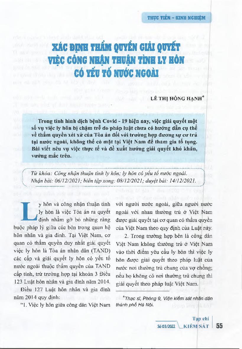 Xác định thẩm quyền giải quyết việc công nhận thuận tình ly hôn có yếu tố nước ngoài