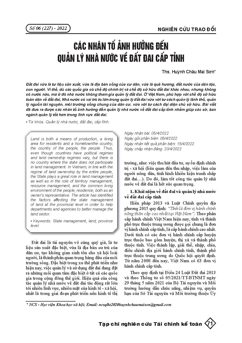 Các nhân tố ảnh hưởng đến quản lý nhà nước về đất đai cấp tỉnh = Influential factors on state management of land in province