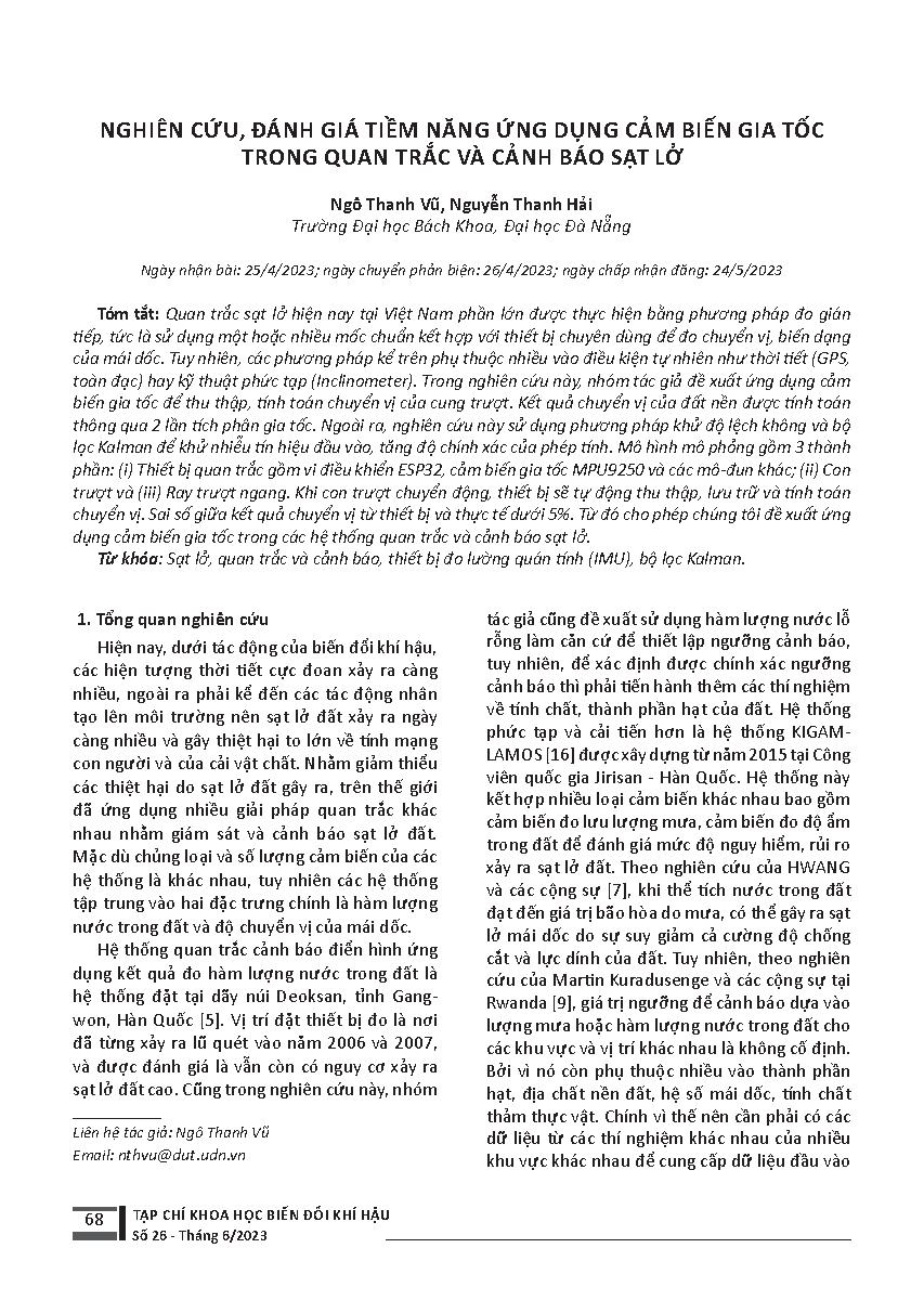 Nghiên cứu, đánh giá tiềm năng ứng dụng cảm biến gia tốc trong quan trắc và cảnh báo sạt lở = Investigation on potential application of accelerometer in landslide monitoring and warning