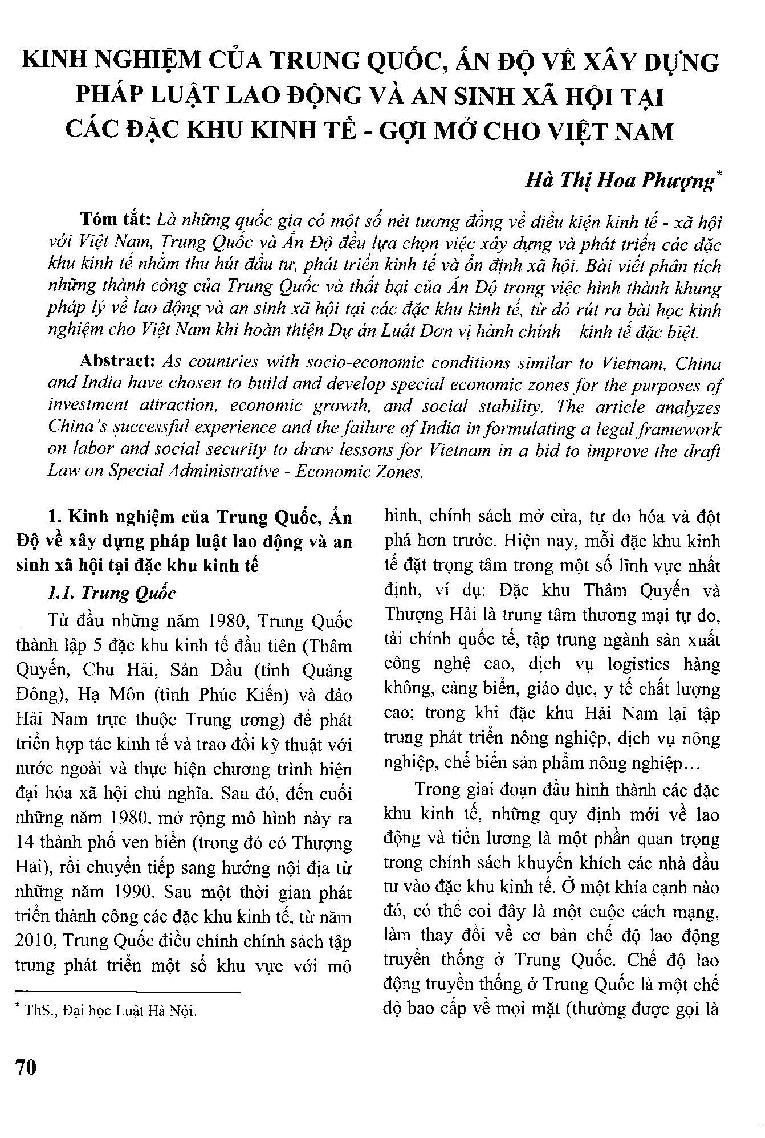 Kinh nghiệm của Trung Quốc, Ấn Độ vè xây dựng pháp luật lao động và an sinh xã hội tại các đặc khu kinh tế - gợi mở cho Việt Nam = The experiences of China and India in building labor and social security laws in special economic zones - suggestive of Vietnam