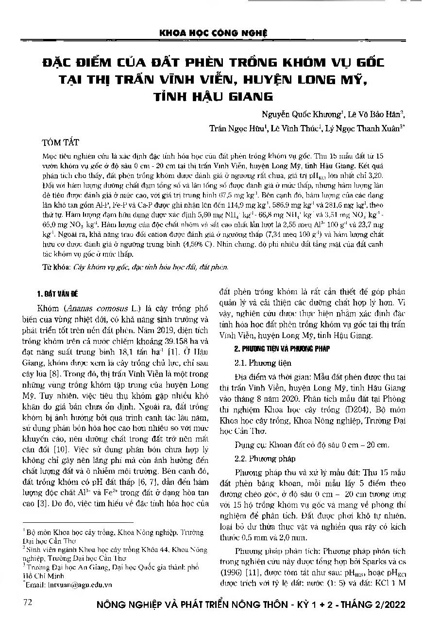 Đặc điểm của đất phèn trồng khóm vụ gốc tại thị trấn Vĩnh Viễn, huyện Long Mỹ, tỉnh Hậu Giang = Property of acid sulfate soil cultivated pineapple ratoon in Vinh Vien town, Long My district, Hau Giang province