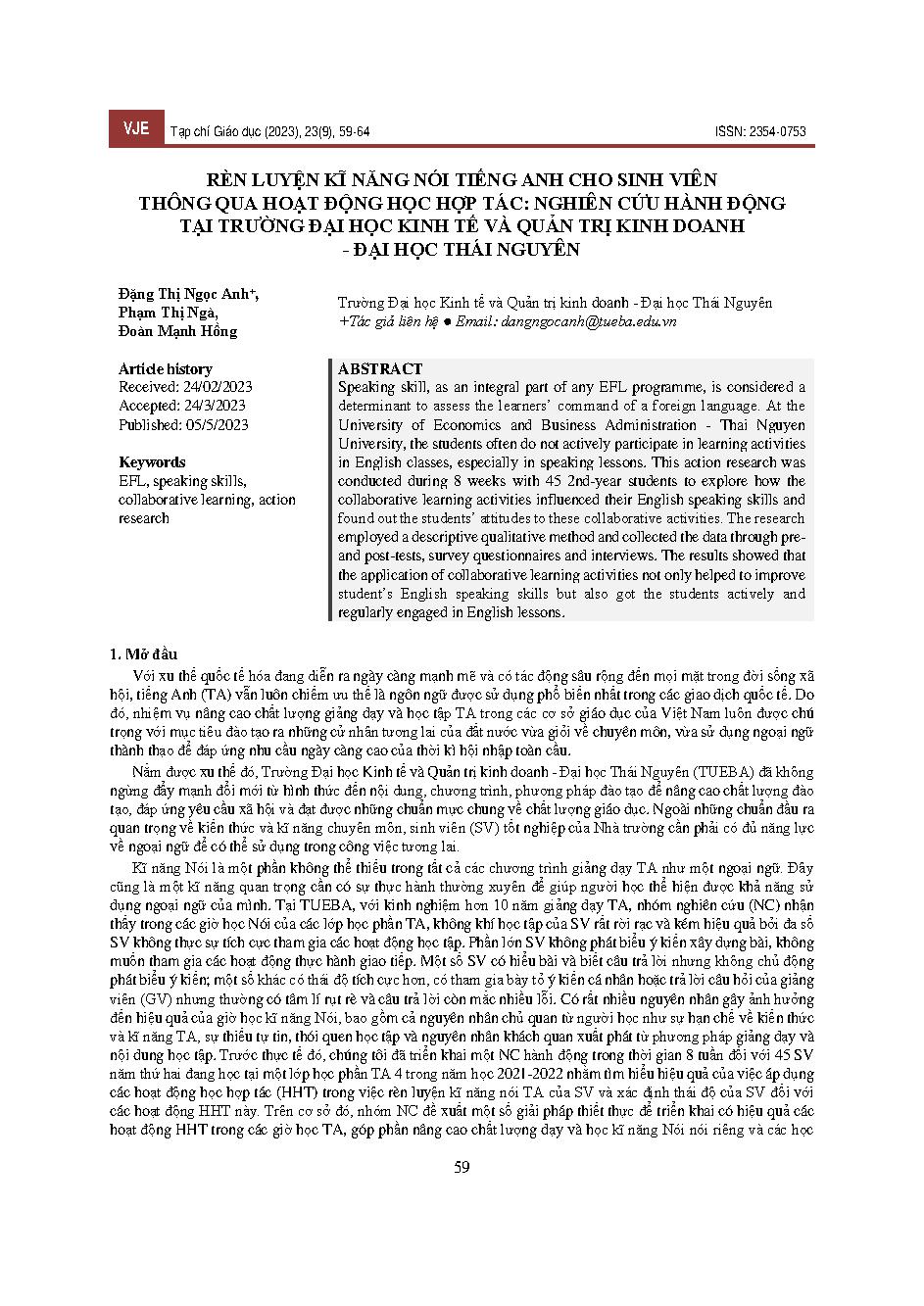 Rèn luyện kĩ năng nói tiếng Anh cho sinh viên thông qua hoạt động học hợp tác: nghiên cứu hành động tại Trường Đại học Kinh tế và Quản trị kinh doanh - Đại học Thái Nguyên = Training students' English speaking skills through cooperative learning activitie