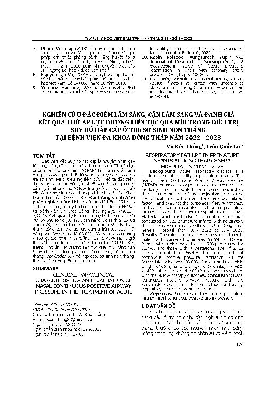 Nghiên cứu đặc điểm lâm sàng, cận lâm sàng và đánh giá kết quả thở áp lực dương liên tục qua mũi trong điều trị suy hô hấp cấp ở trẻ sơ sinh non tháng tại Bệnh viện Đa khoa Đồng Tháp năm 2022 - 2023 = Clinical, paraclinical characteristics and evaluation