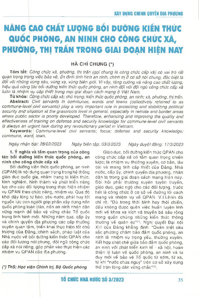 Nâng cao chất lượng bồi dưỡng kiến thức quốc phòng, an ninh cho công chức xã, phường, thị trấn trong giai đoạn hiện nay = Improving the quality of training on national defense and security for civil servants in communes, wards and towns in the current per