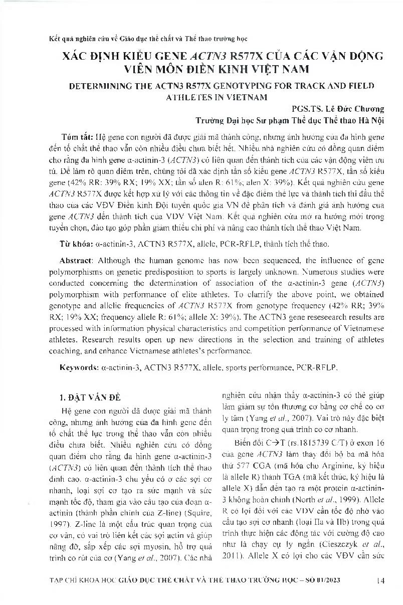 Xác định kiểu gene ACTN3 R577X của các vận động viên môn Điền kinh Việt Nam = Determining the ACTN3 R577X genotyping for track and field athletes in Vietnam